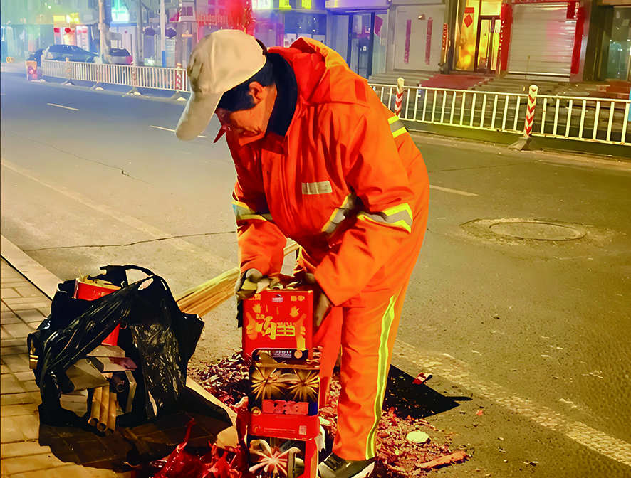 在集宁区中心广场临街商铺的门前,环卫工人王学清早早地蹲守在街边,等待着“扫红”的指令。今年是她从事环卫工作以来,第3次参与除夕夜的“扫红”任务。“除夕夜是我们一年里最紧张的时刻,‘扫红’的时候一定要注意安全,有些炮没燃尽,直接动手会被烫伤。这几年国家对燃放烟花爆竹的规定越来越严格,人们的素质也提高了,燃放的时候很守规矩。”王学清说道。