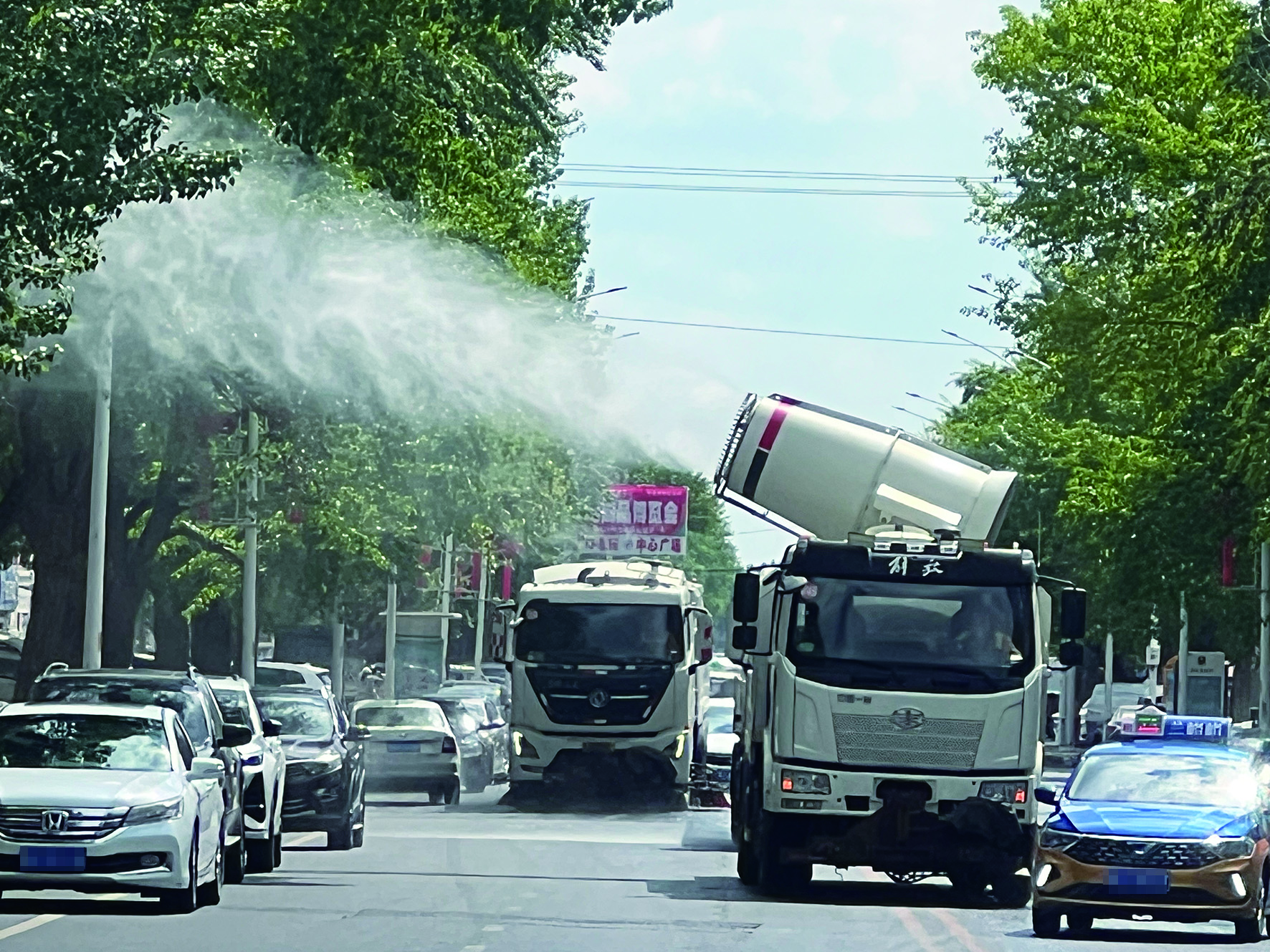 ●雾炮车向空中喷出水雾压制飞絮本报记者 鲍娜 摄